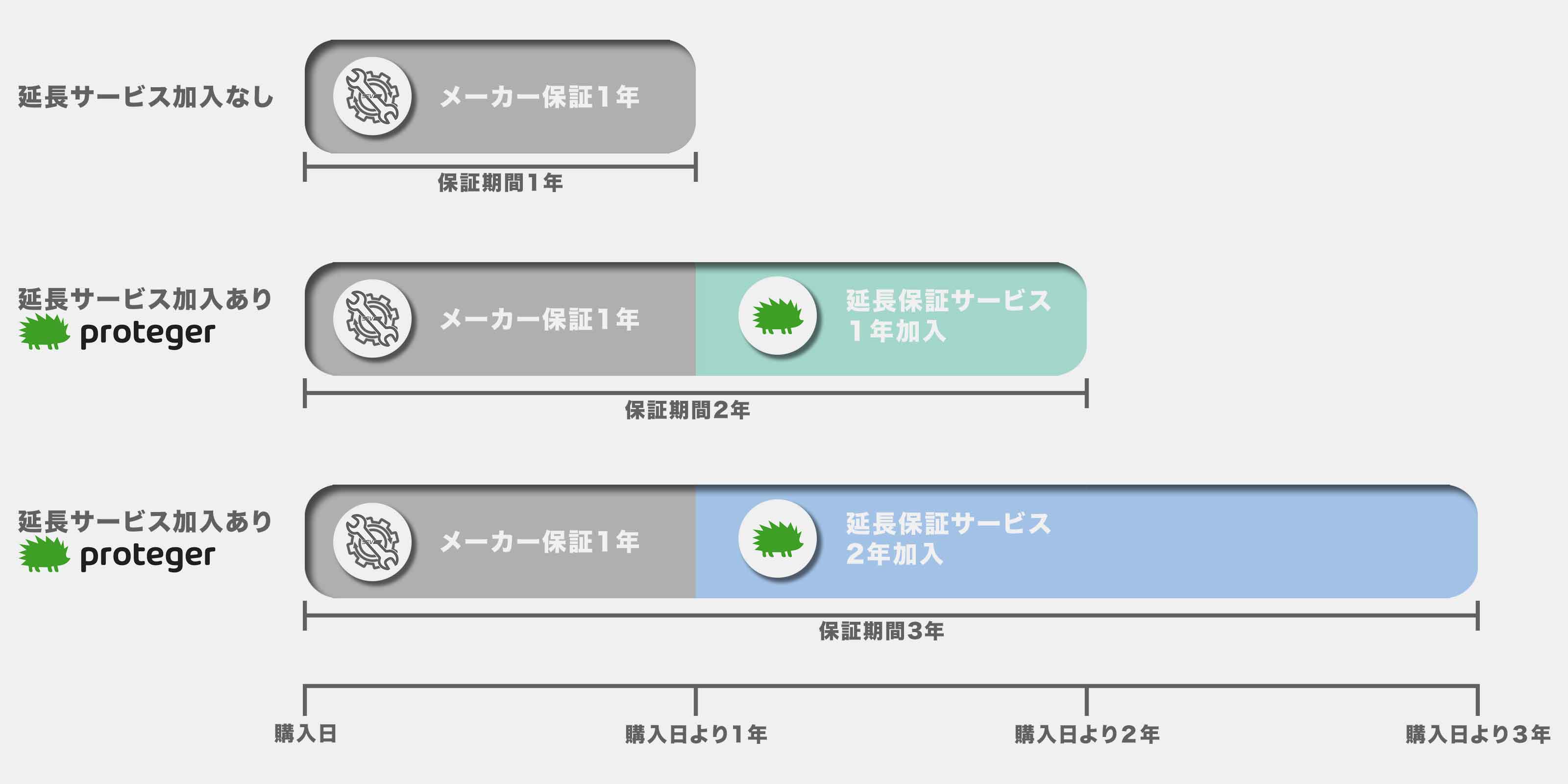 メーカー保証1年間+proteger長期保証2年間=合計3年間の保証