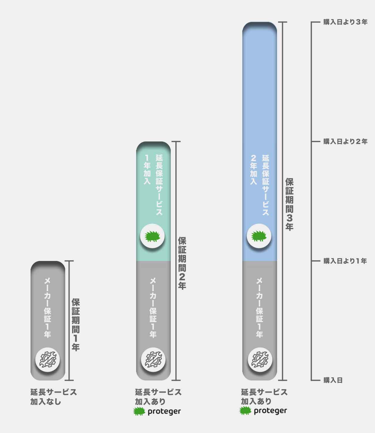 メーカー保証1年間+proteger長期保証2年間=合計3年間の保証