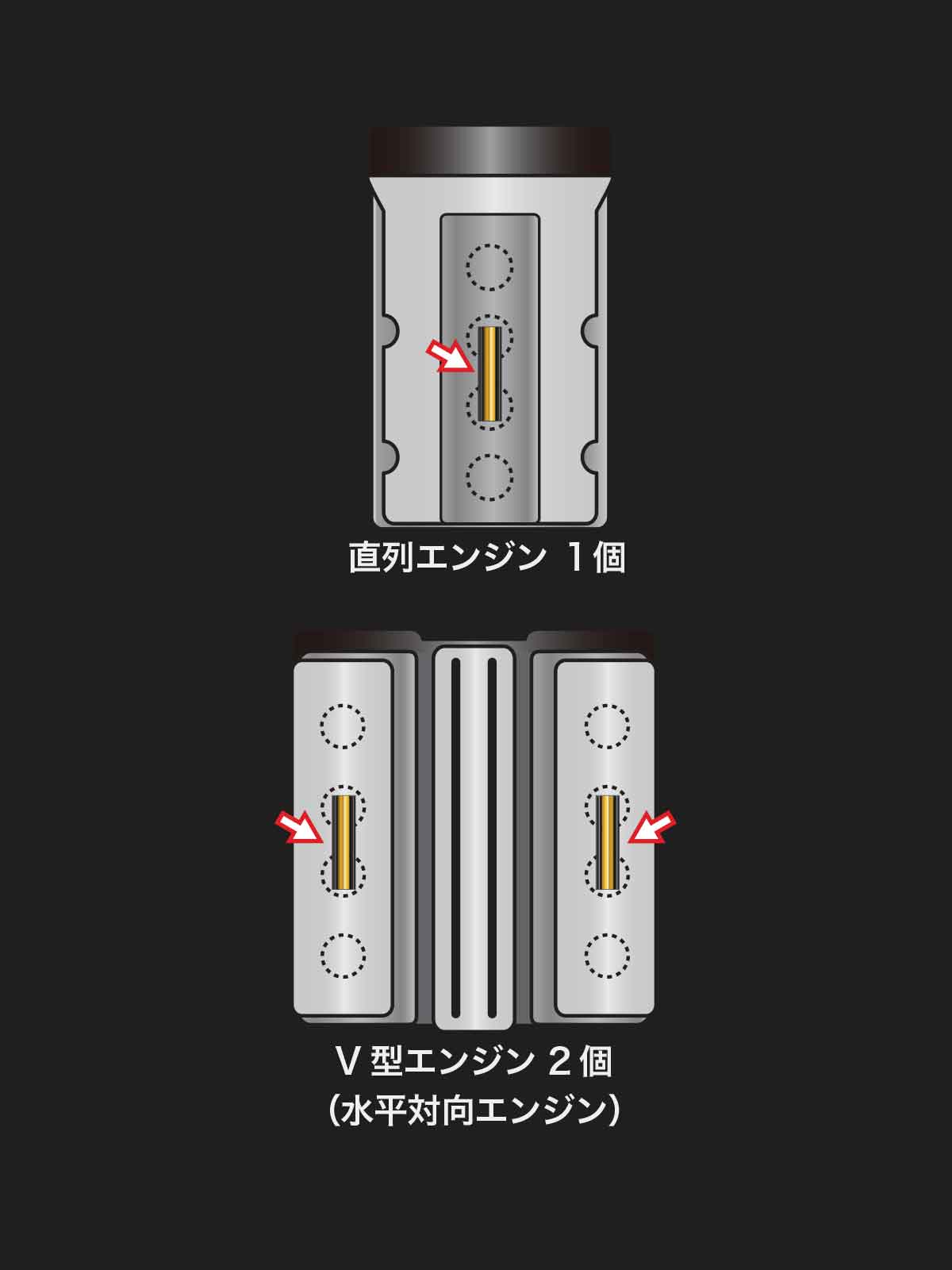 - V型エンジン、水平対向エンジンは2ヶ所に装着。