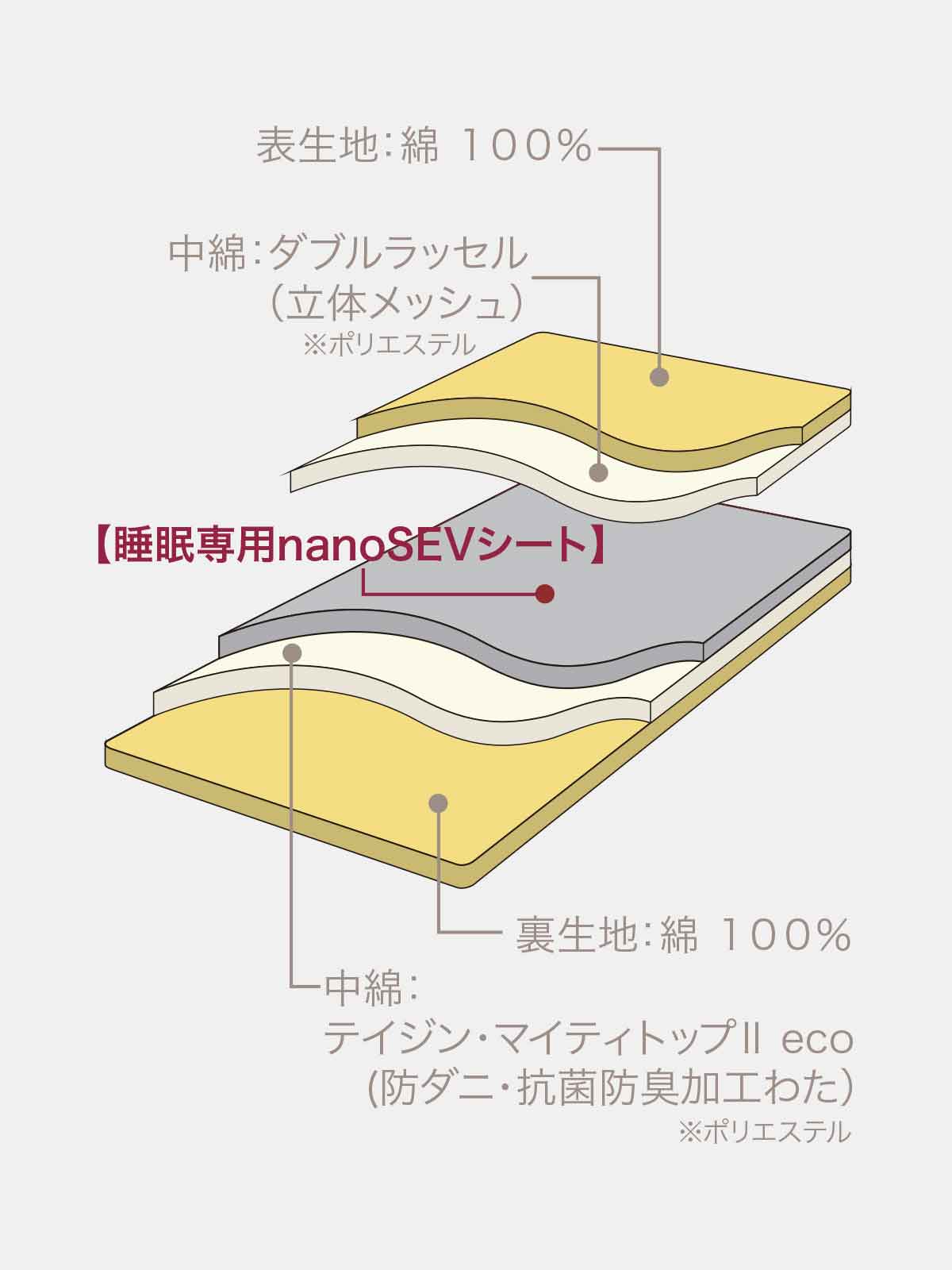 「SEVファンスリープ+」は、長年の実績からフィードバックされ開発された「睡眠専用nanoSEVシート」をパッド全面に採用。カラダ全身を包み込み、快眠へ導きます。 材料の品質にもこだわり、お手入れ方法も簡単です。中綿には防ダニ、防臭にも優れたテイジン・マイティトップII ecoを採用。お手入れ方法も簡単で、家庭でのお洗濯が可能です。日本製ですので、ご安心してお使いいただけます。