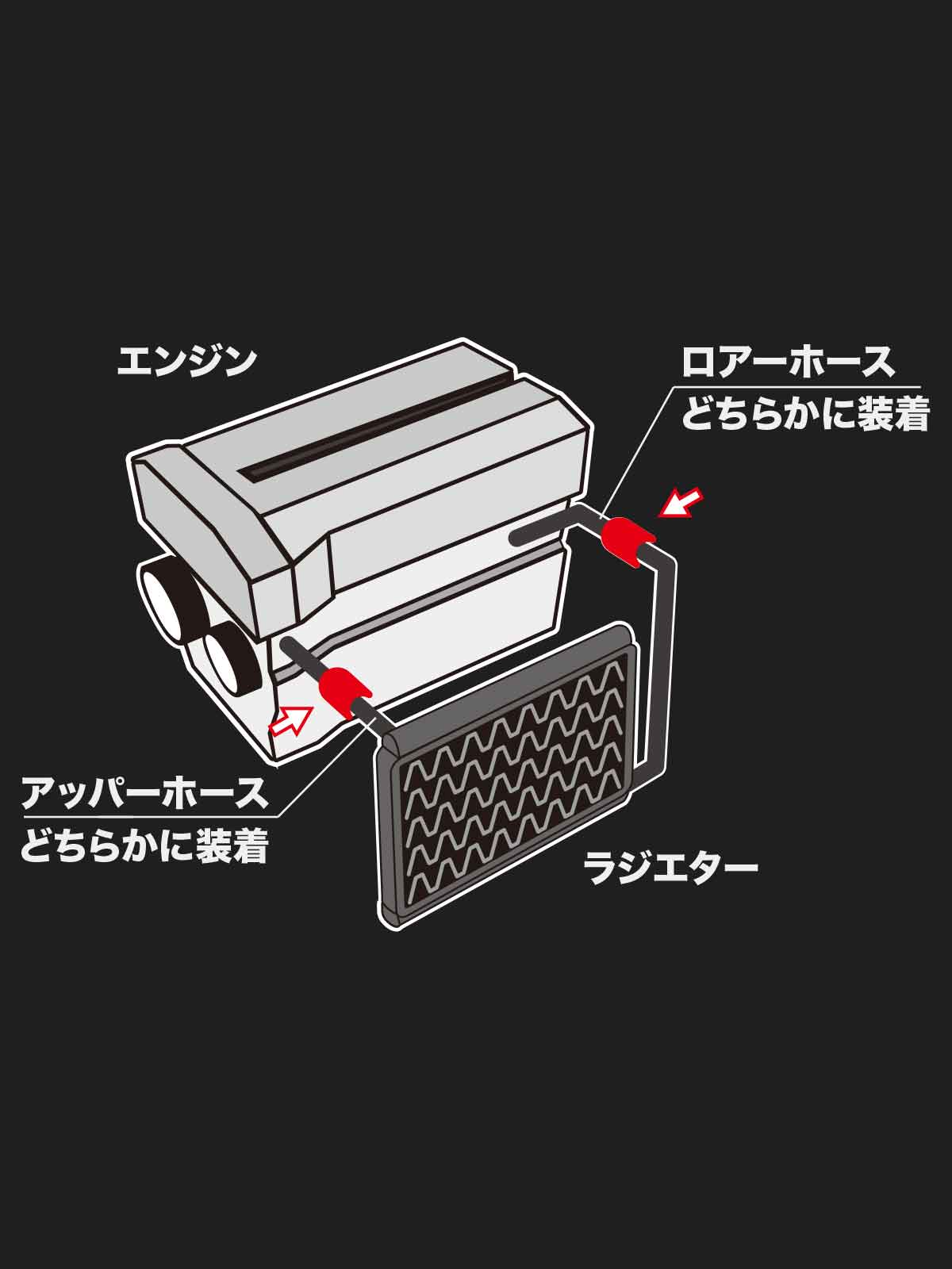 ラジエターホース(アッパーホース、ロアーホースのどちらか)に装着してください。
